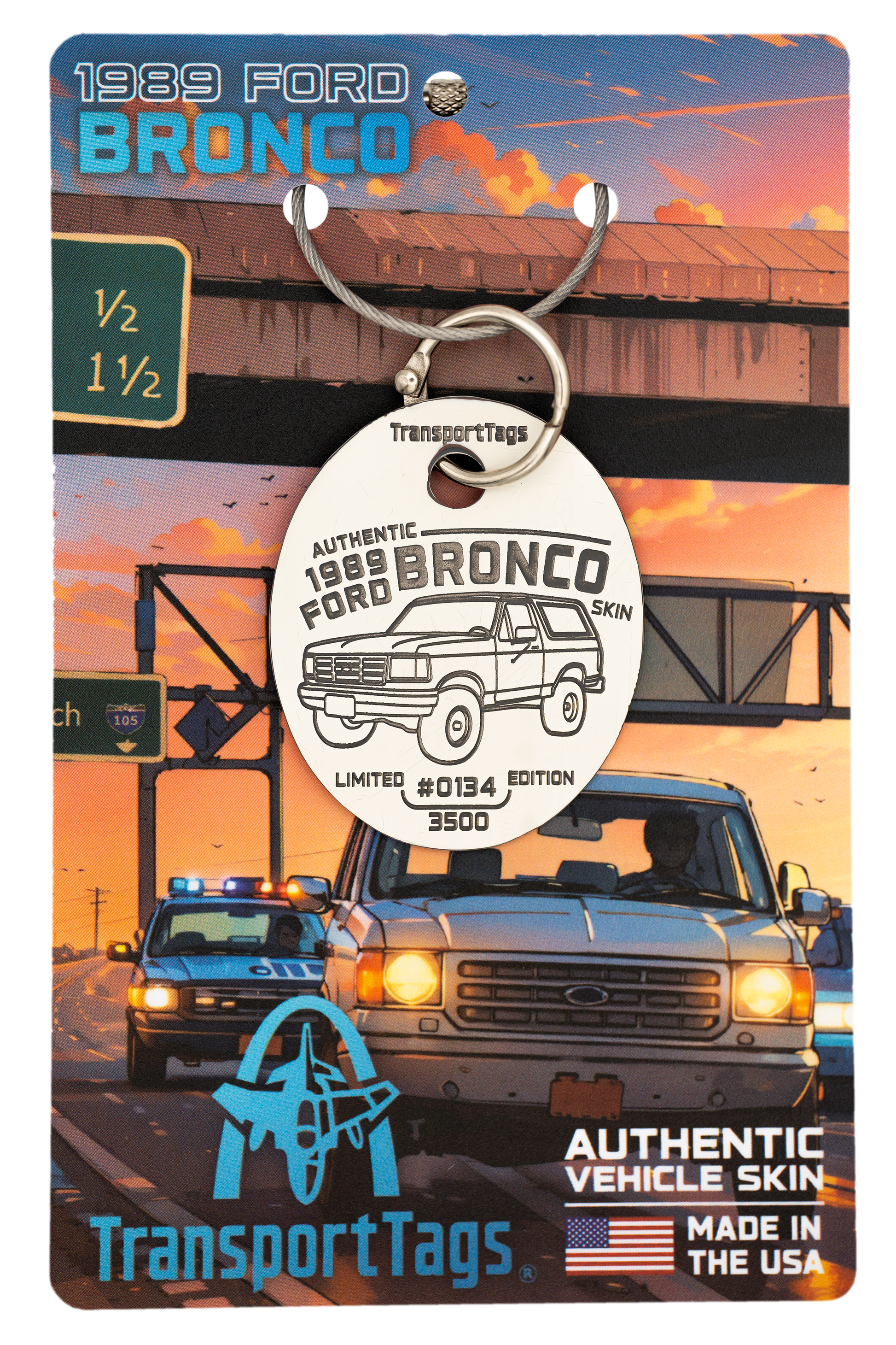 Our featured '89 Bronco, a 4th generation spectacle, though not directly involved in the OJ Simpson chase, shares the fame and aura of those unforgettable times. Now we are giving it a new lease on life, personifying its spirit and embodying memories from its heyday in our TransportTags collectibles.