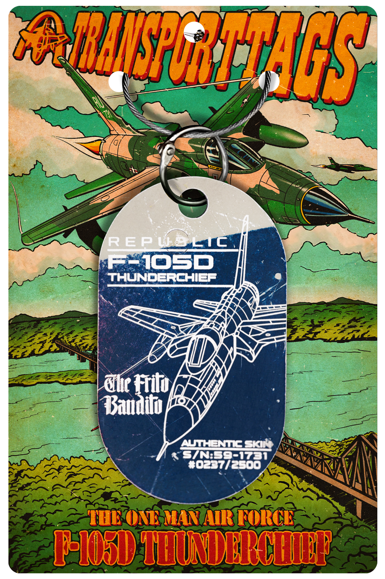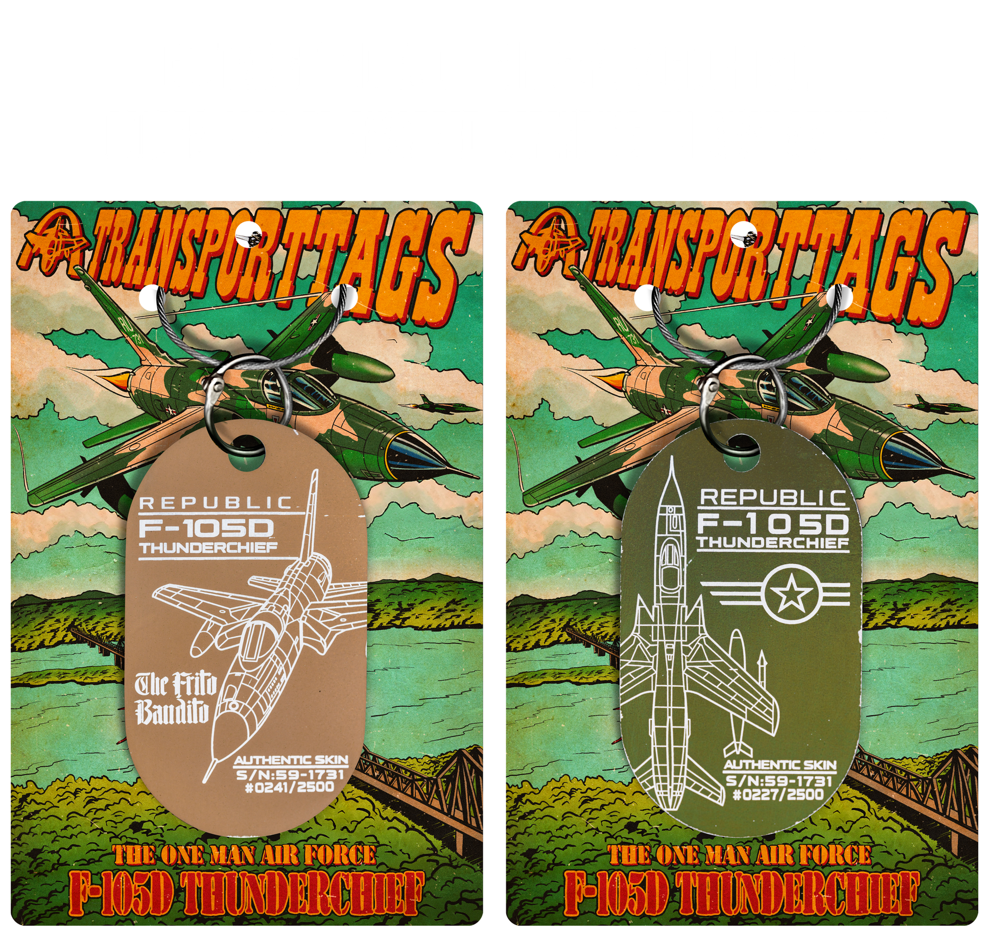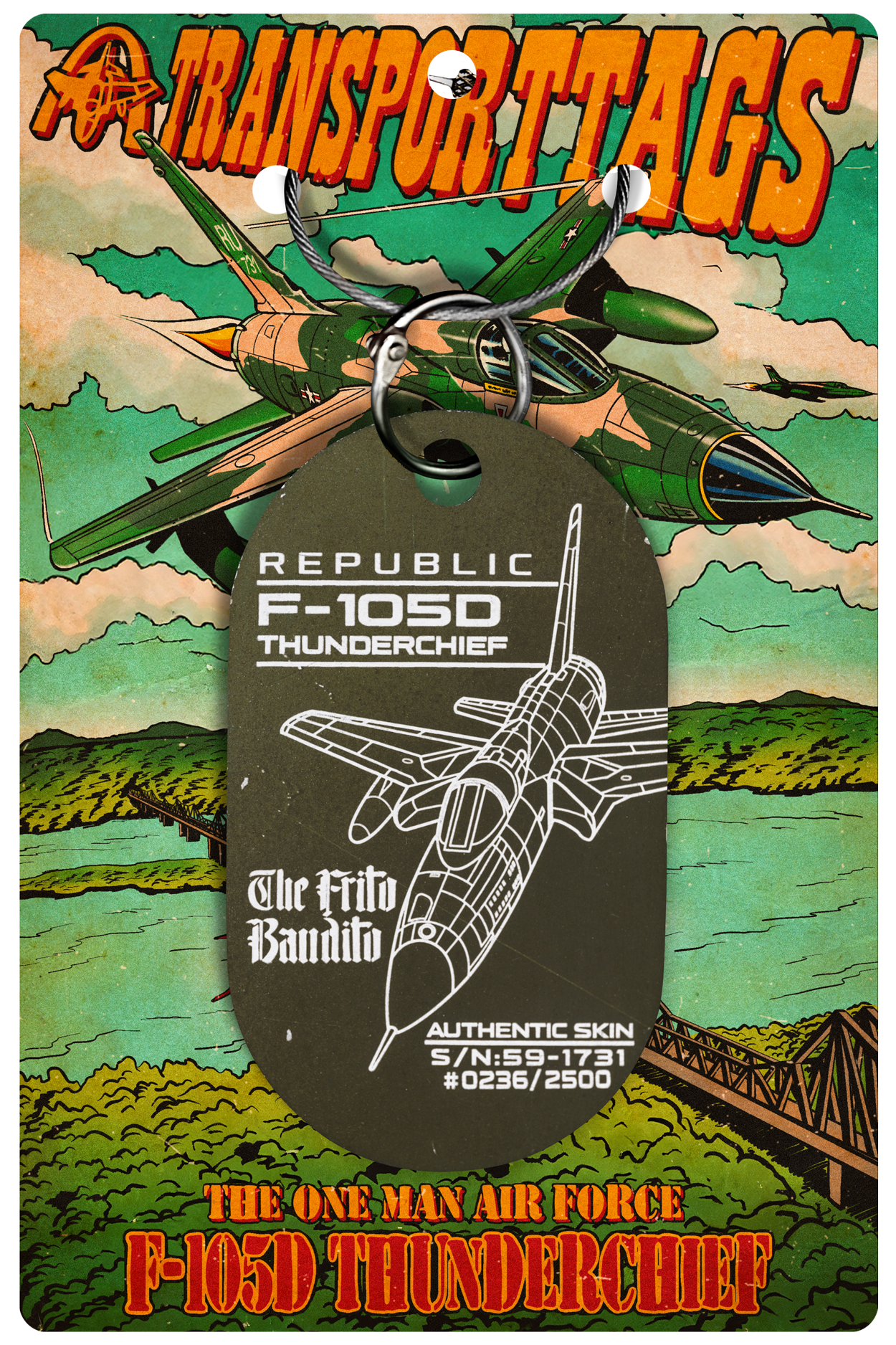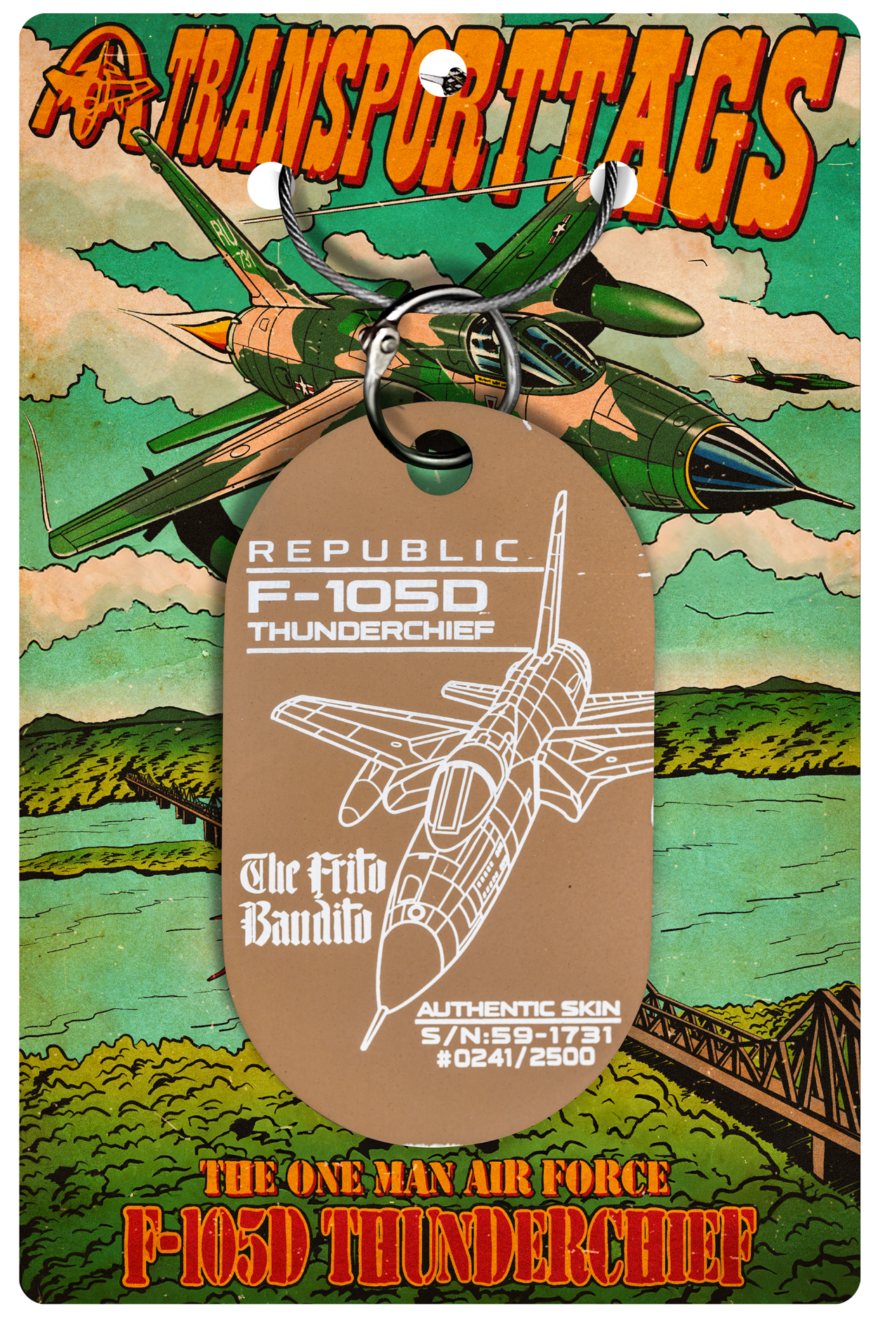 Our F-105D Thunderchief tag is proudly handcrafted from the skin of an F-105D Thunderchief that saw significant combat during the Vietnam War.