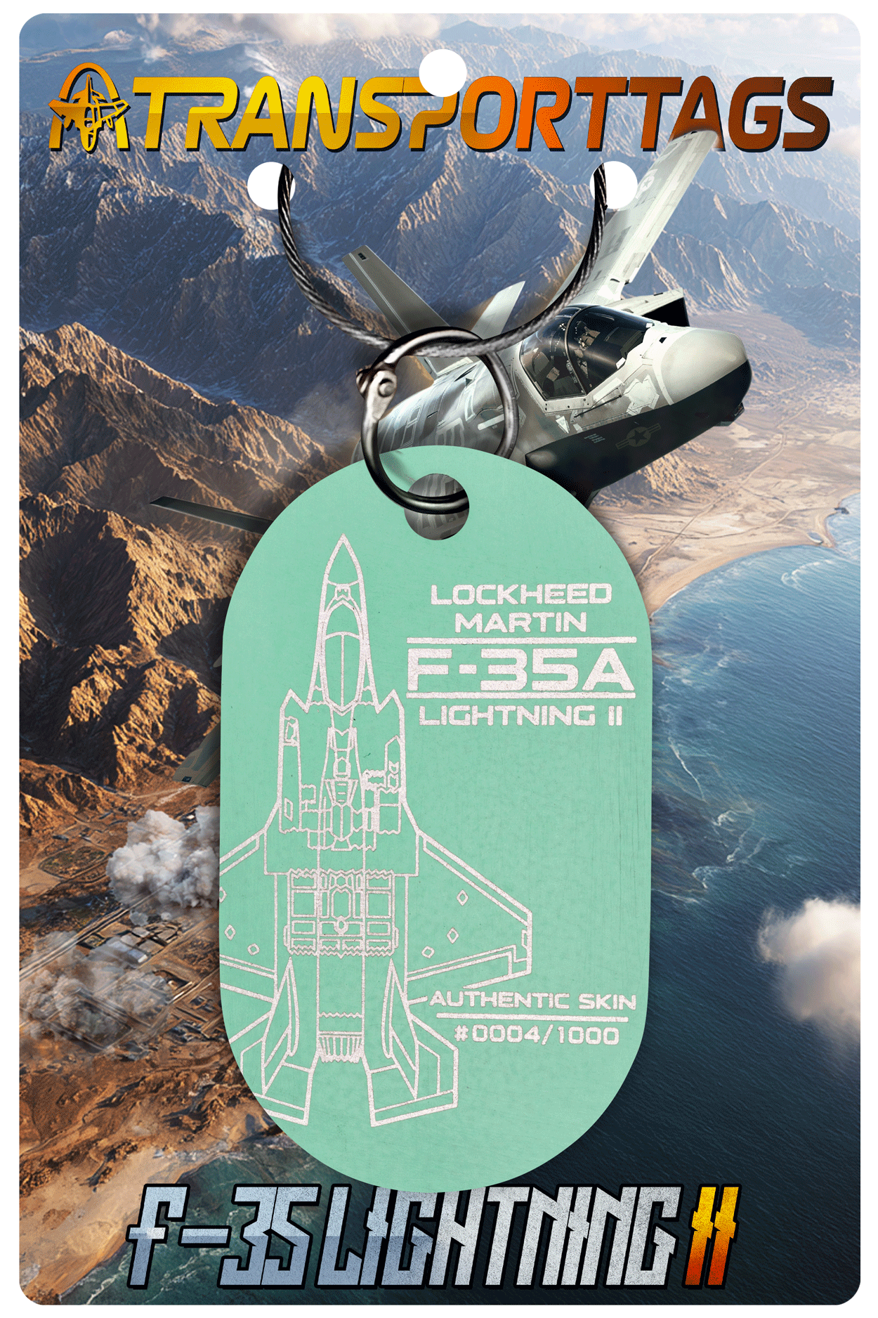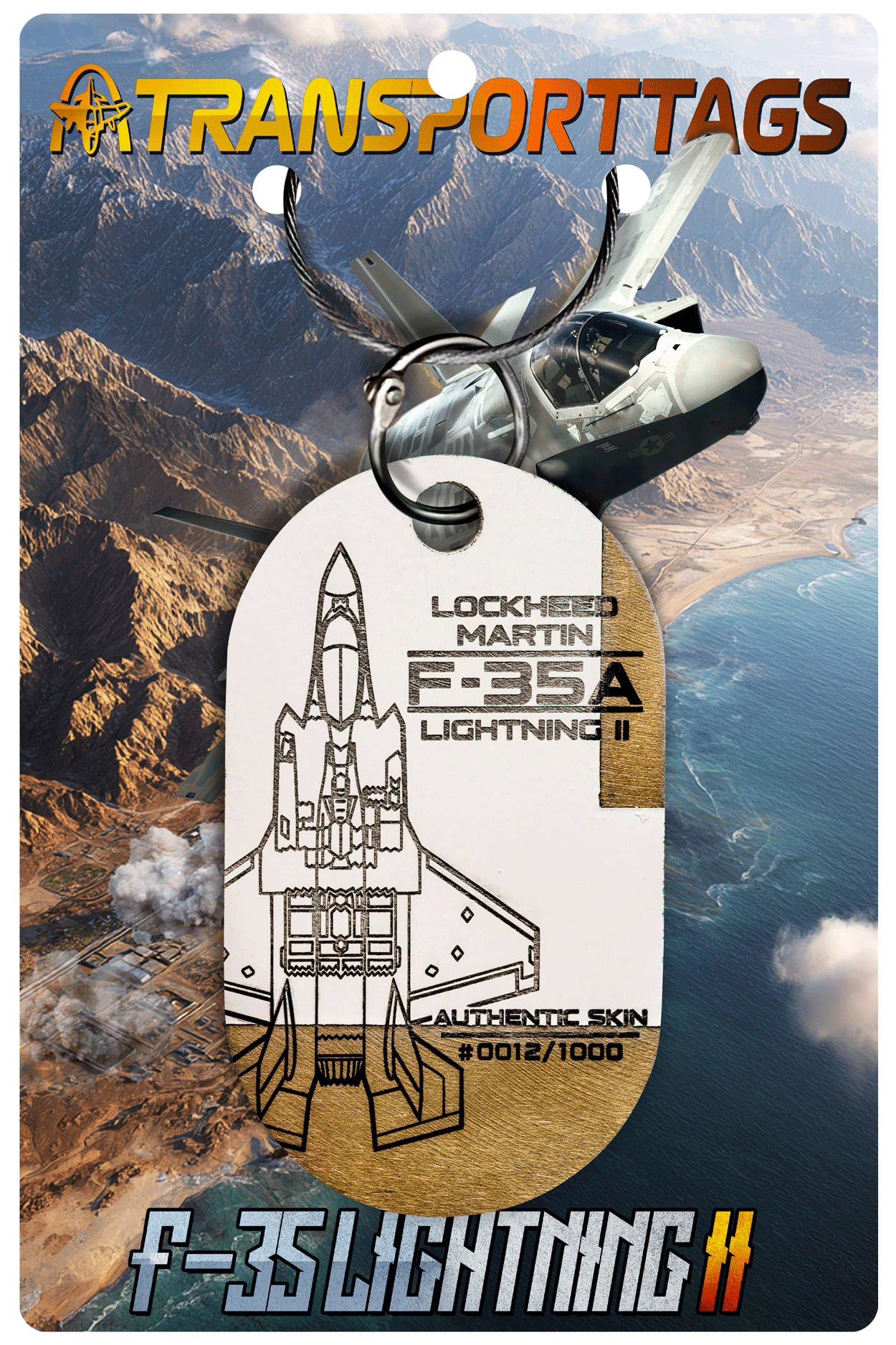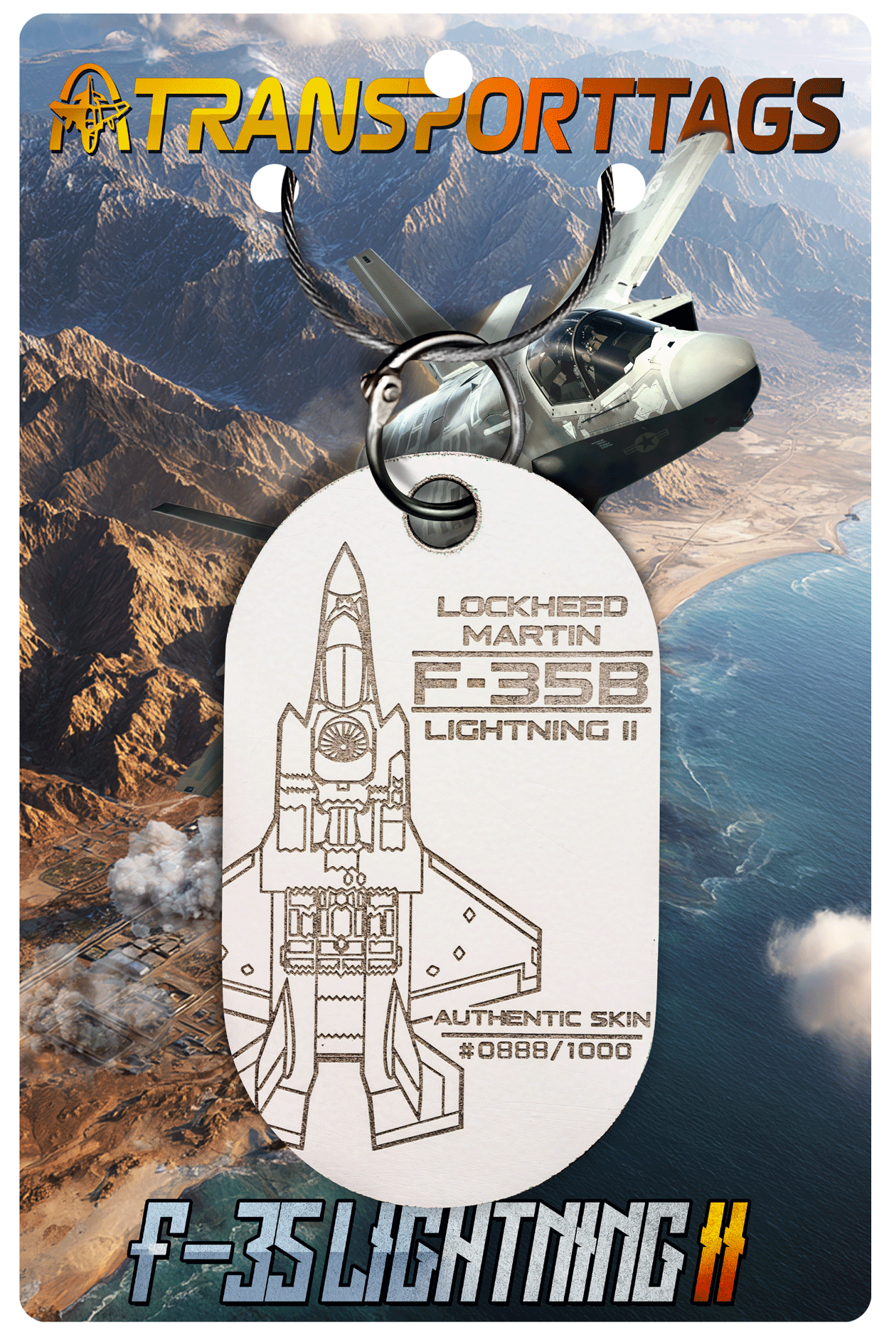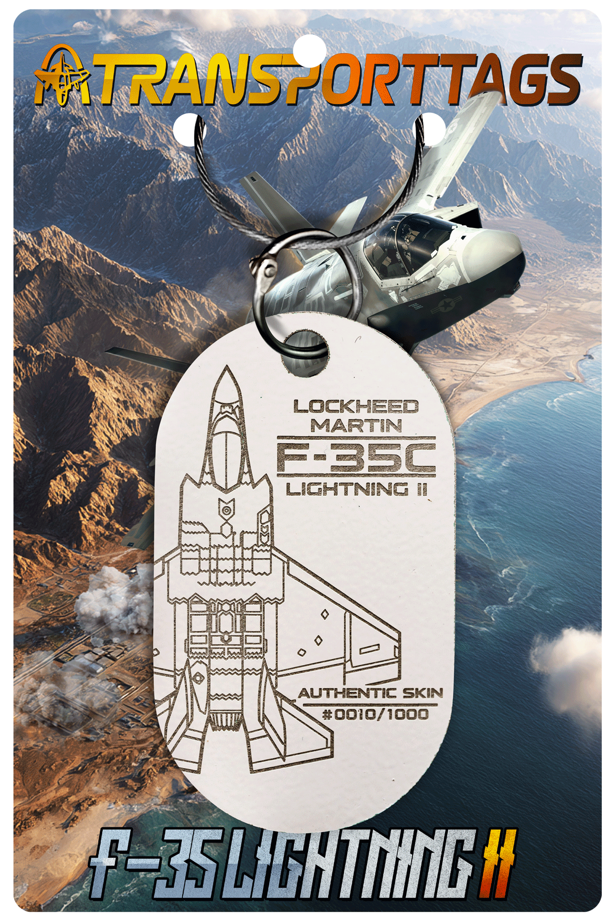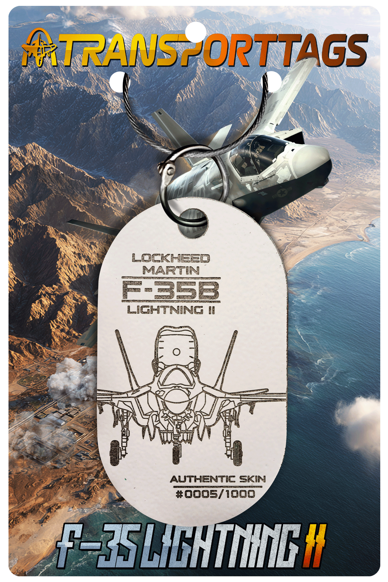 We are proud to offer these stunning F-35 Lightning II TransportTags, crafted from small, demilitarized, and publicly available pieces of older-generation aluminum alloy aircraft materials. These materials are processed through water jetting, cut into small pieces, laser-engraved, and cleaned in an acid wash.