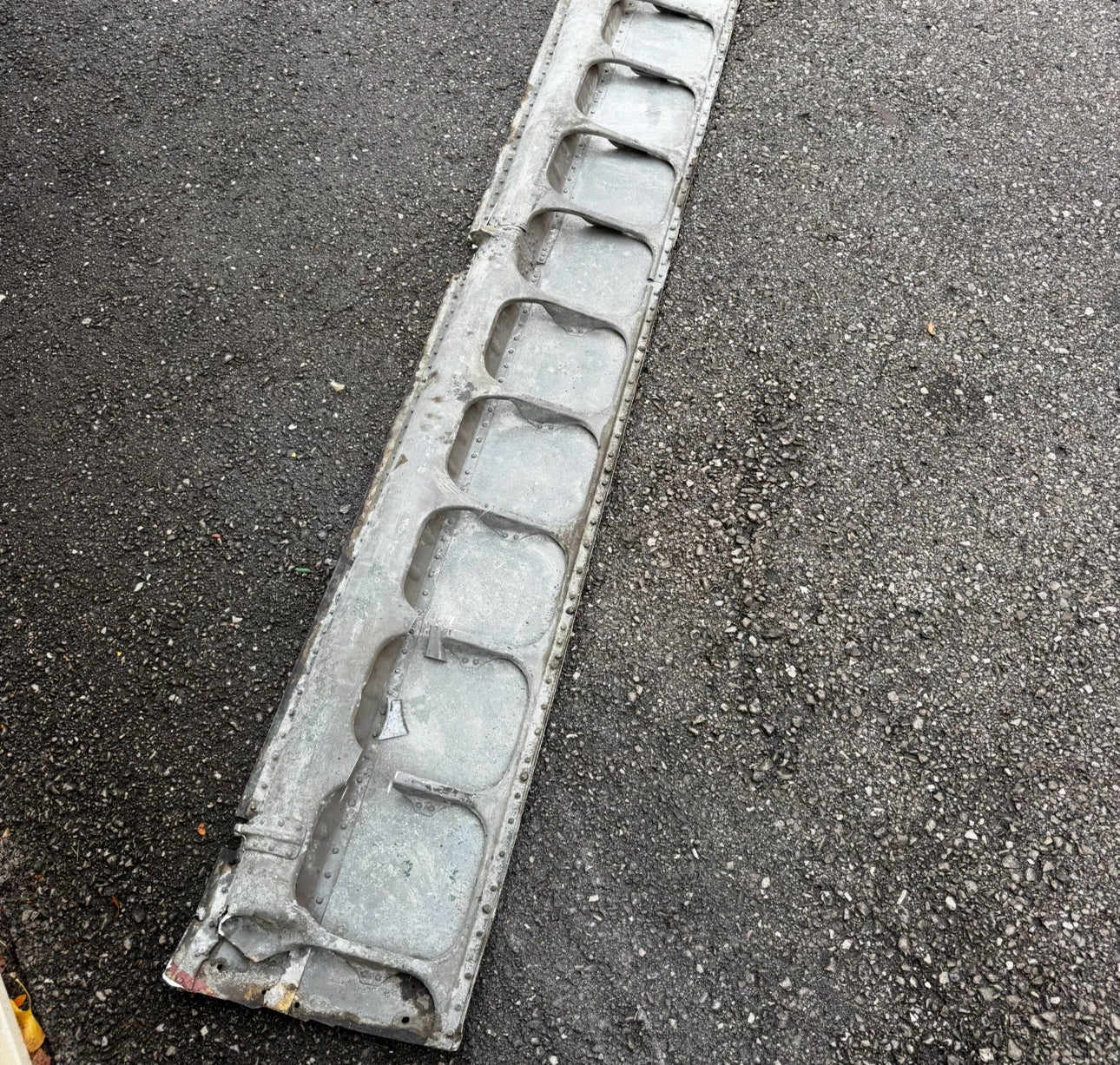 The flap’s all‑green finish and the recovery location strongly suggest an association with Jagdgeschwader 26 (JG‑26), which operated FW 190s over the Channel and Western Front in late 1944–45; artifacts recovered in that border region frequently trace back to air combat, forced landings or crash sites from that period. Each tag contains genuine material from the conserved FW-190D flap and retains visible traces of original paint and mounting details, offering a direct, tangible link to the Dora and to WWII aeronautical history.