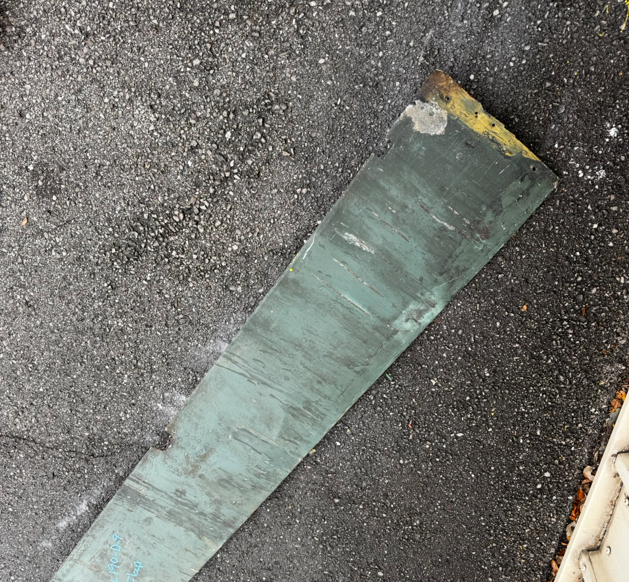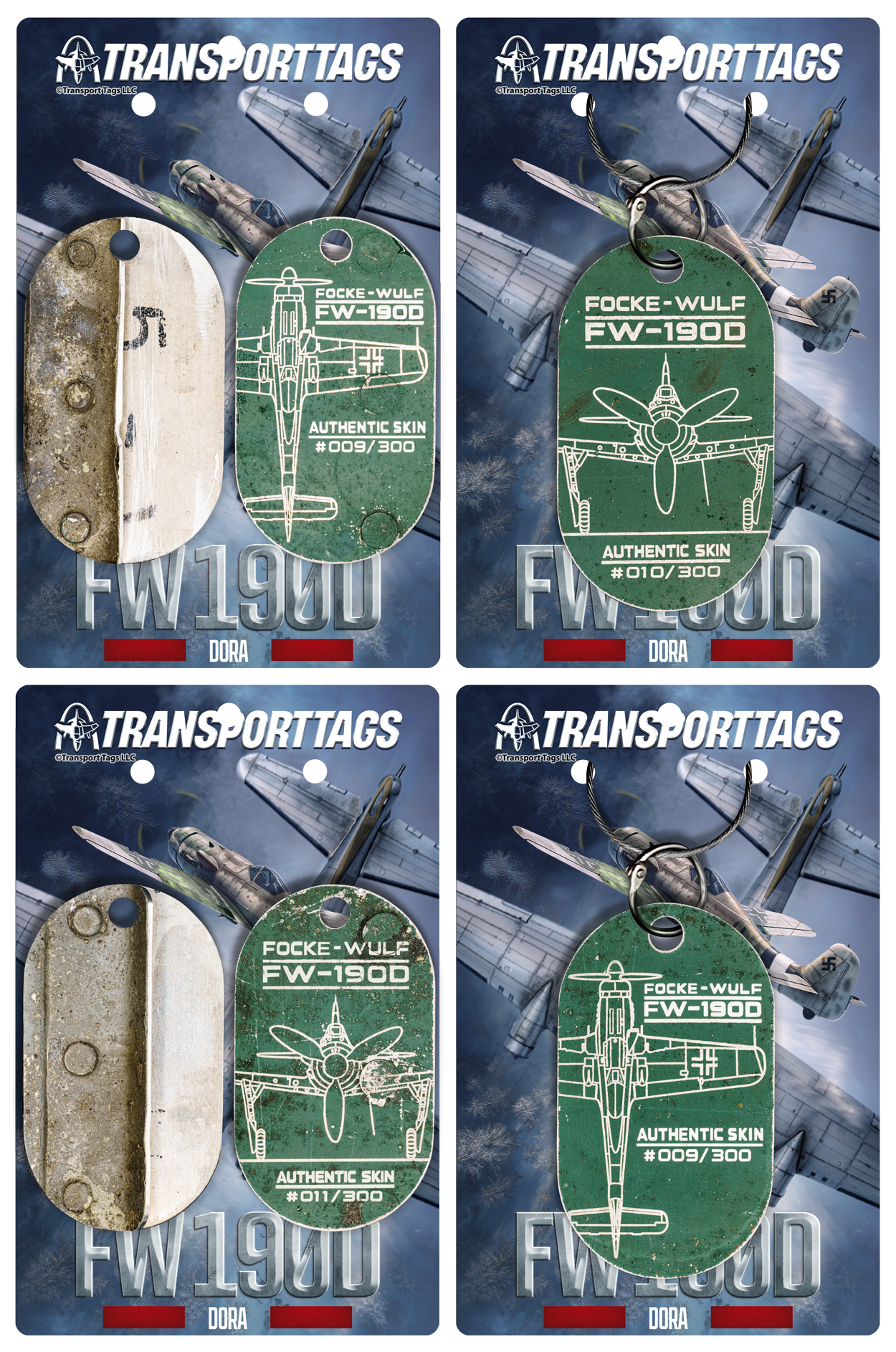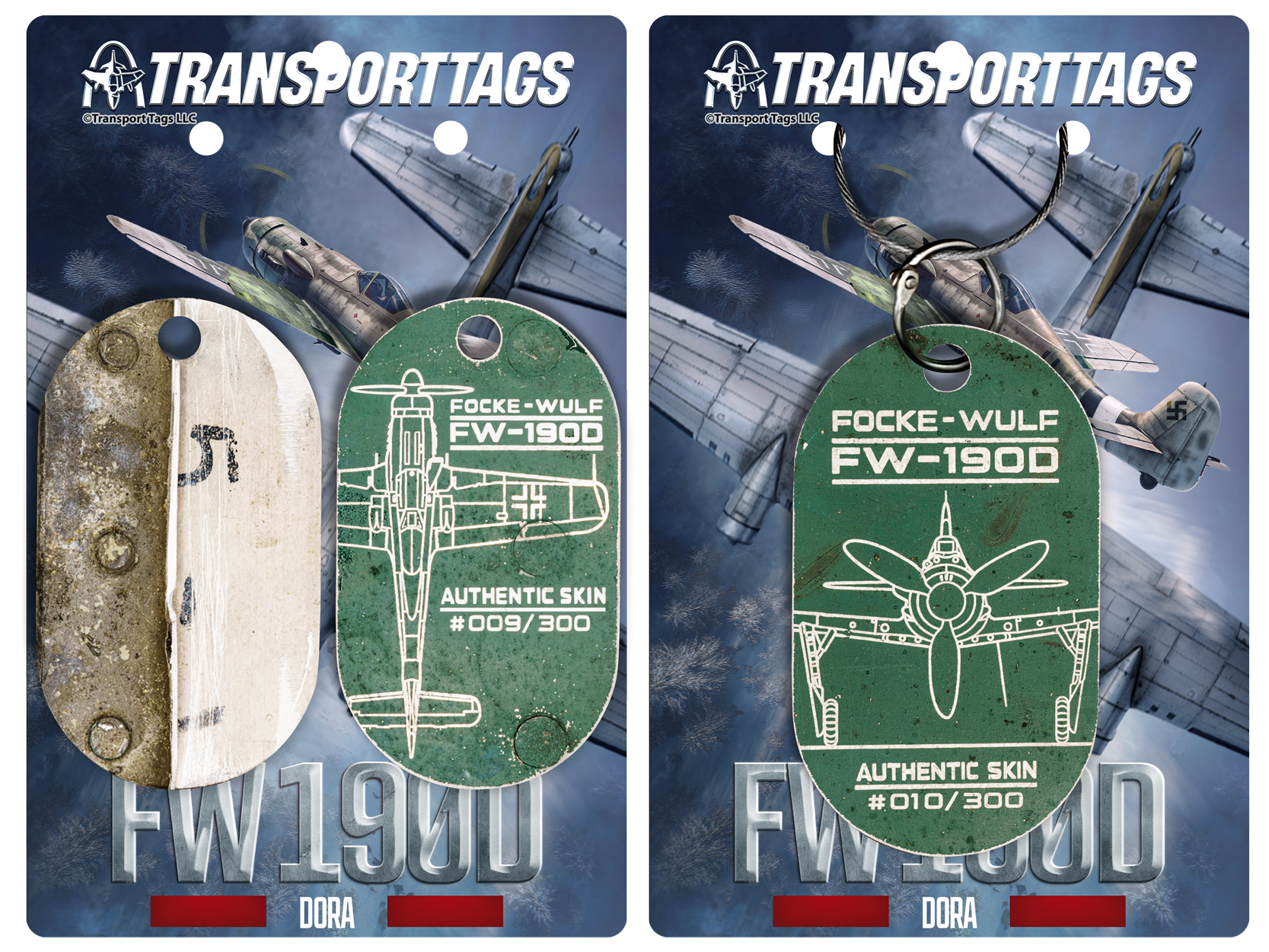 These TransportTags are made from metal recovered from an original FW-190D upper flap. The flap most closely matches an early D‑9 production pattern rather than later D‑11/D‑12 variants: construction details such as the all‑metal upper skin and internal fittings align with early D‑9 manufacture. The flap was sourced from an avid WWII aviation historian and European collector who recovered it near a German/Dutch border town, where it had been repurposed for decades as a shed roof. While coated in roofing tar when found, that covering paradoxically sealed and protected the outer skin, preserving original green camouflage and markings beneath in exceptionally good condition. It was a painstaking process to remove the tar in a way that did not damage the paint beneath.