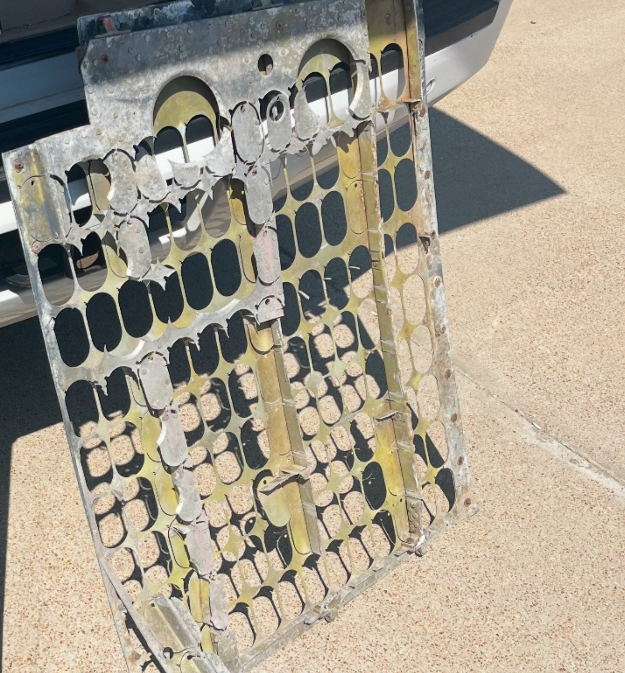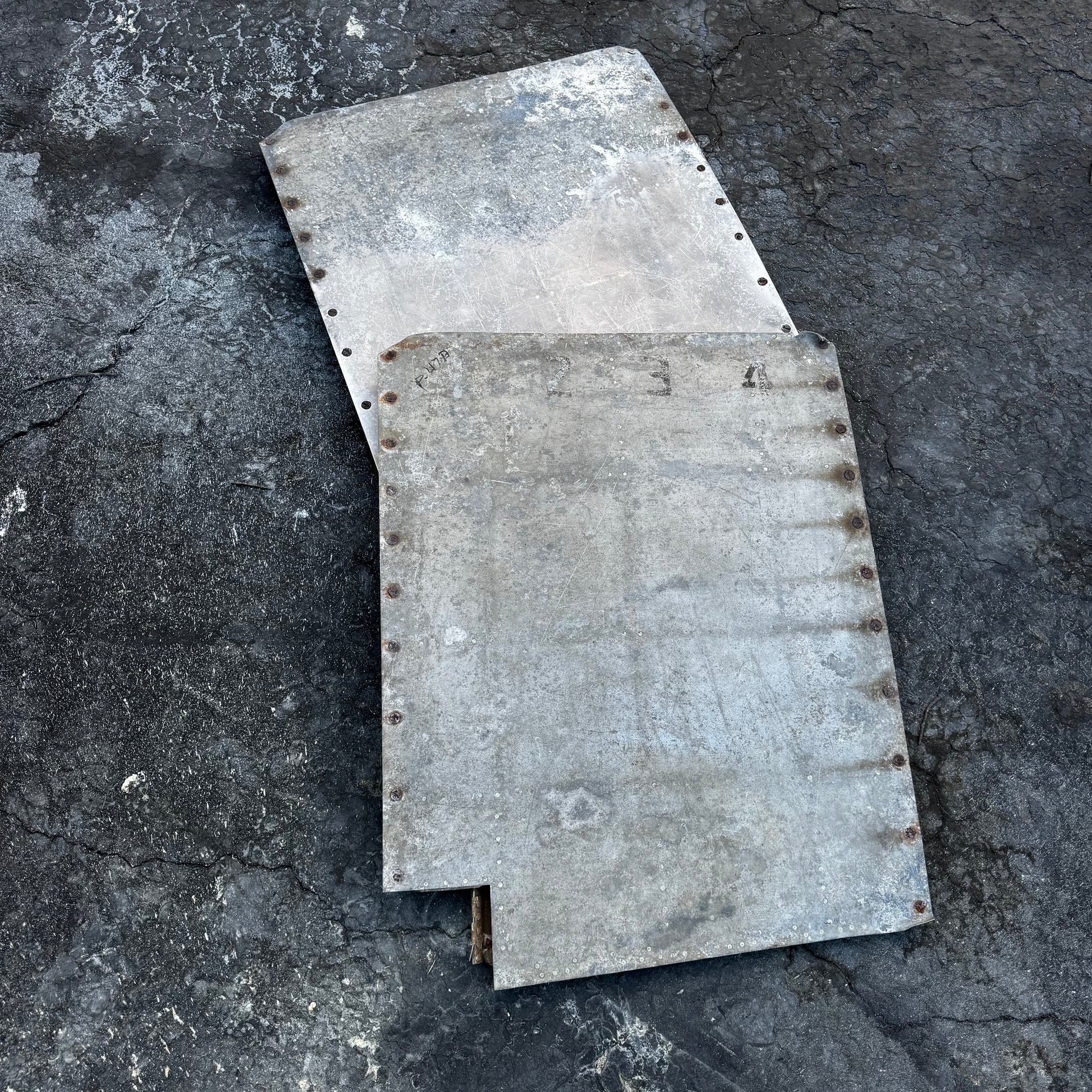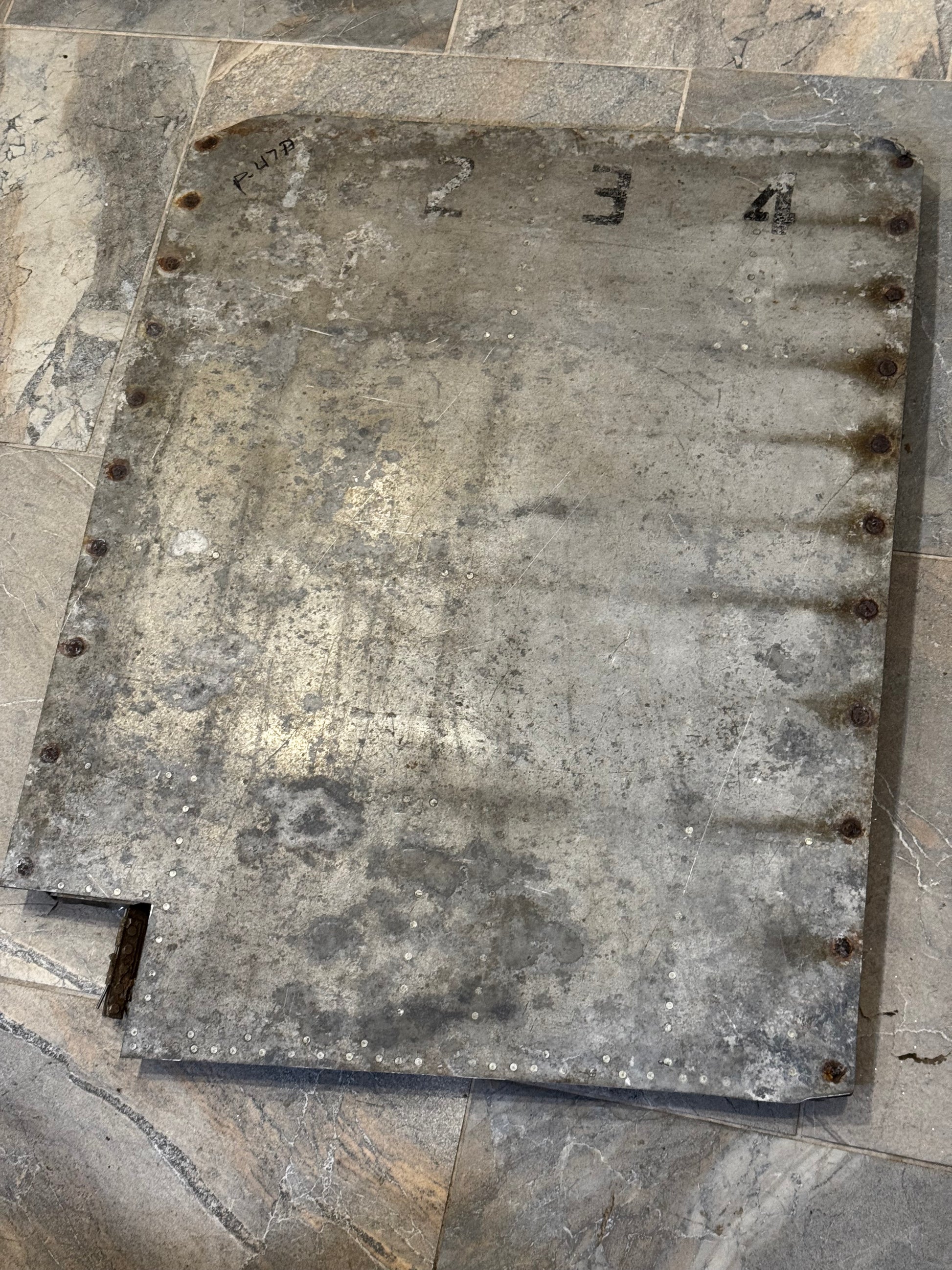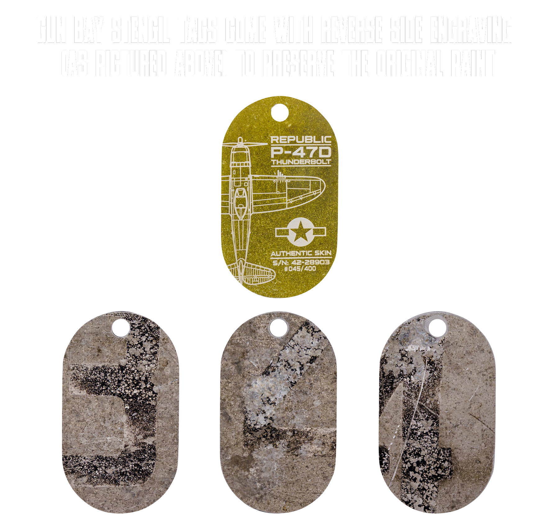 Stripped for parts, its legacy was preserved when we acquired the gun access bay panels from a private collector in Europe. The panels were either taken off during routine maintenance and replaced before the taxiing accident or most likely, stripped off the plane after it was deemed unsalvageable due to the accident. Initially, the locals of the airfield were using the panels as roofing for sheds and outhouses and the panels subsequently traded hands within Europe before we brought them back to the U.S. We repurposed them in 2025 in order to continue this legendary “Jugs” story.