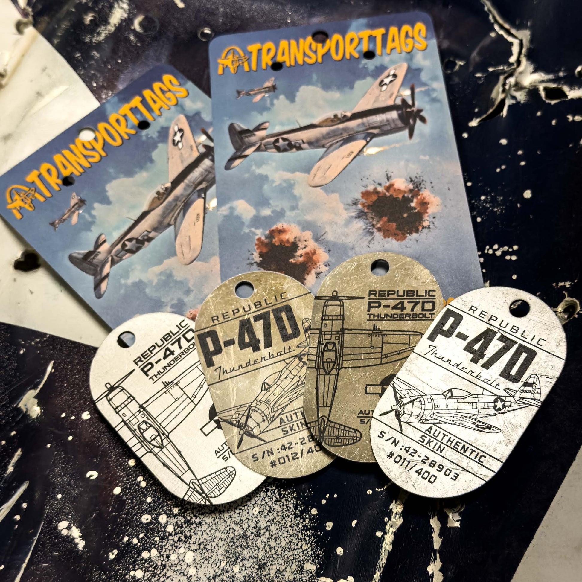 The TransportTags Republic P-47D Thunderbolt tag was crafted from gun bay access doors that each cover four of the 8 total .50-caliber machine guns taken from P-47D-28 S/N: 42-28903, a Republic bubble canopy model with combat history. Piloted by Lieutenant J. Howard Baier during the Battle of the Bulge—a critical campaign highlighting the P-47’s resilience and effectiveness in ground attack, our P-47 was attached to the 391st Fighter Squadron and the 366th Fighter Group during World War II.