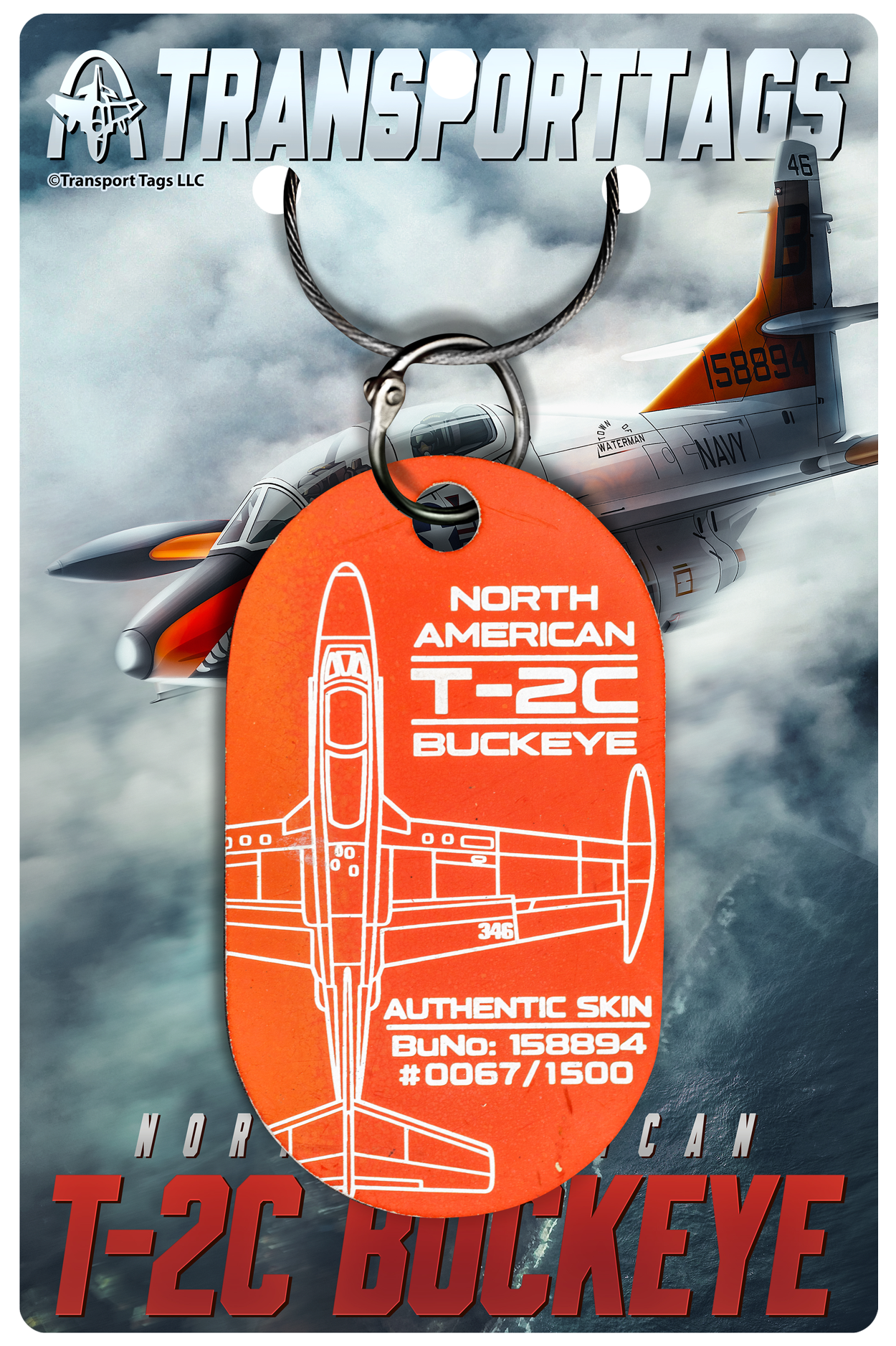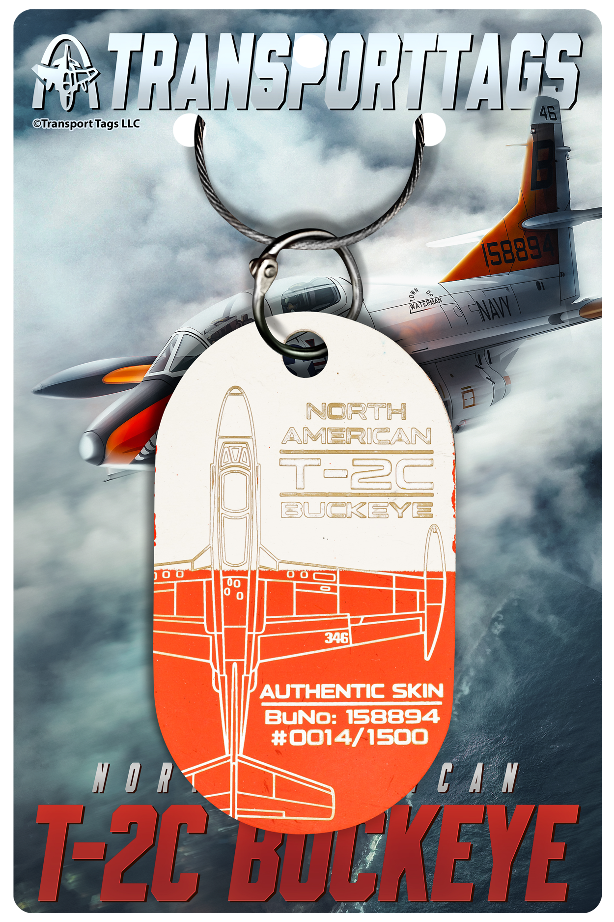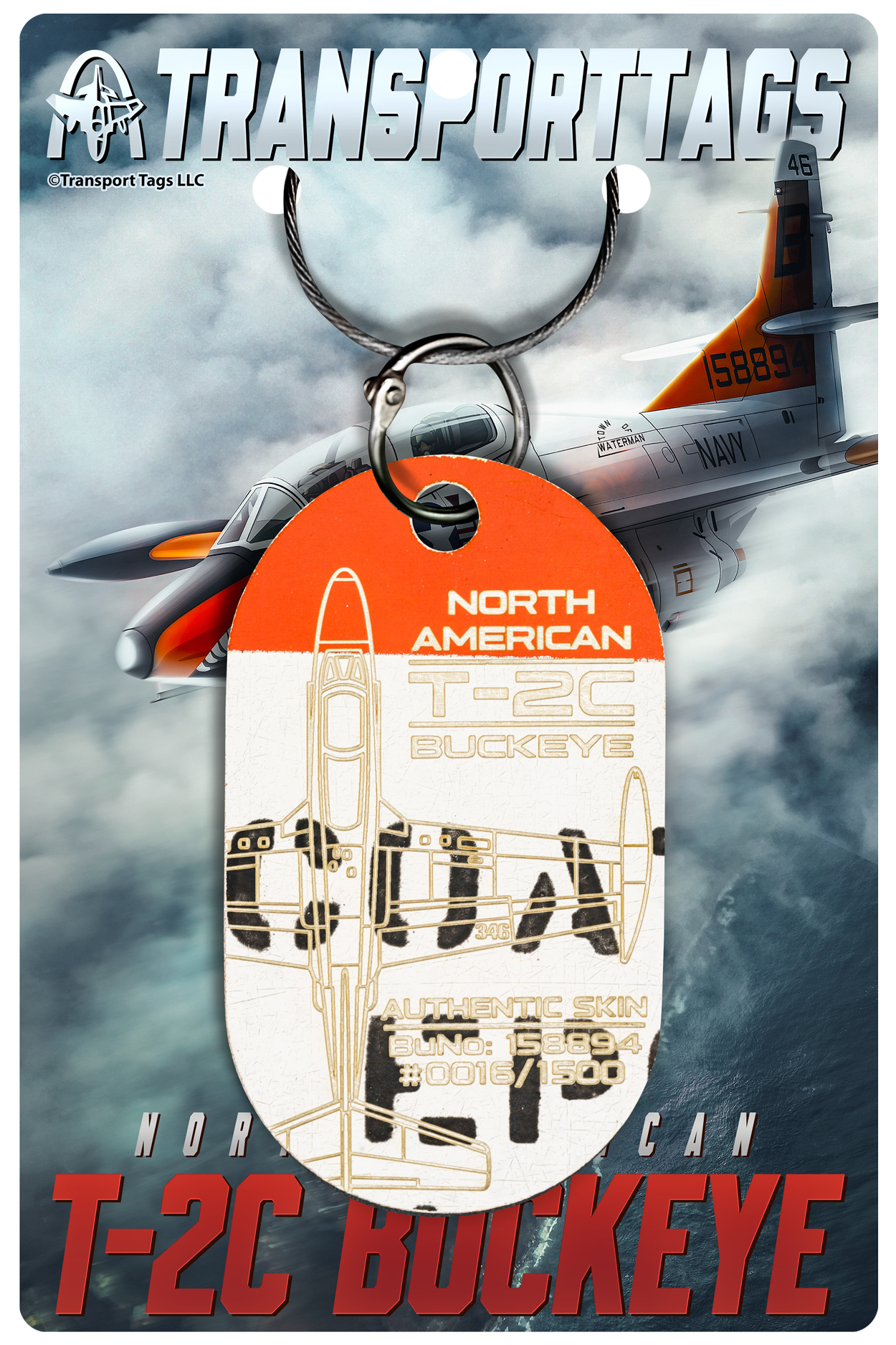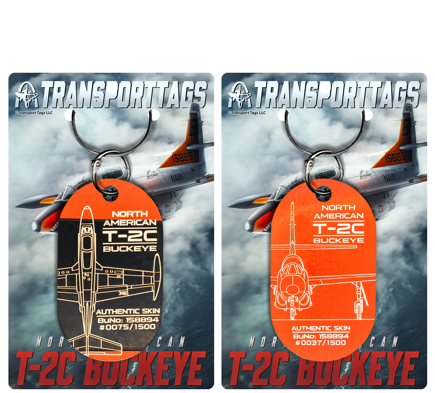 Introducing the T-2C Buckeye TransportTag. This T-2C served with the VT-23 “Professionals” at Brownsville, Texas, where it trained naval aviators in advanced jet techniques. In 2024, we were pleased to acquire the tail section and wing from BUNO 158894 — distinctive for its shark tooth nose livery — from AVMATS, through our valued friend and collaborator, Justin Giessman. We are thrilled to partner with him on this project to bring this aircraft’s history to life in our custom tags.