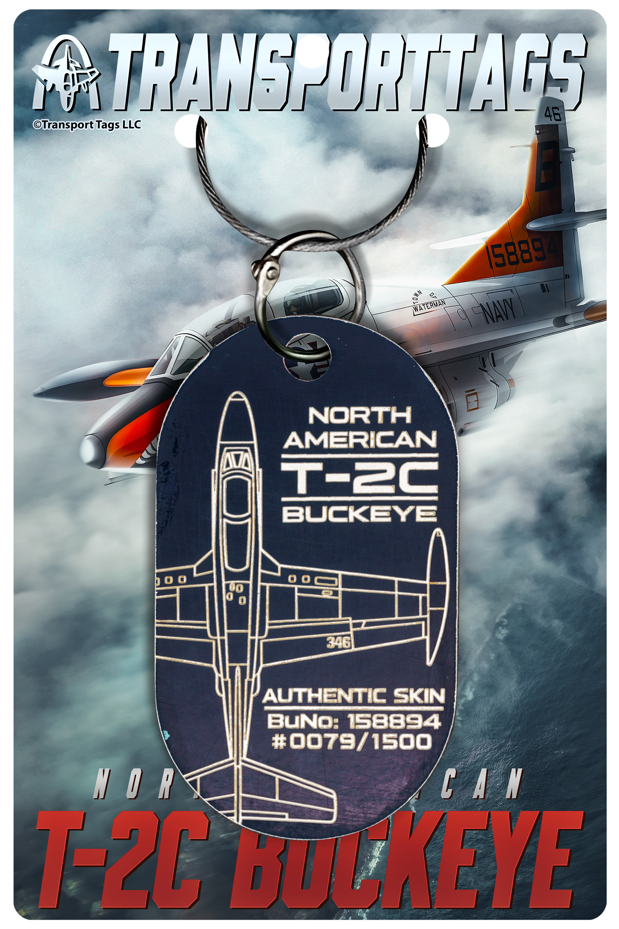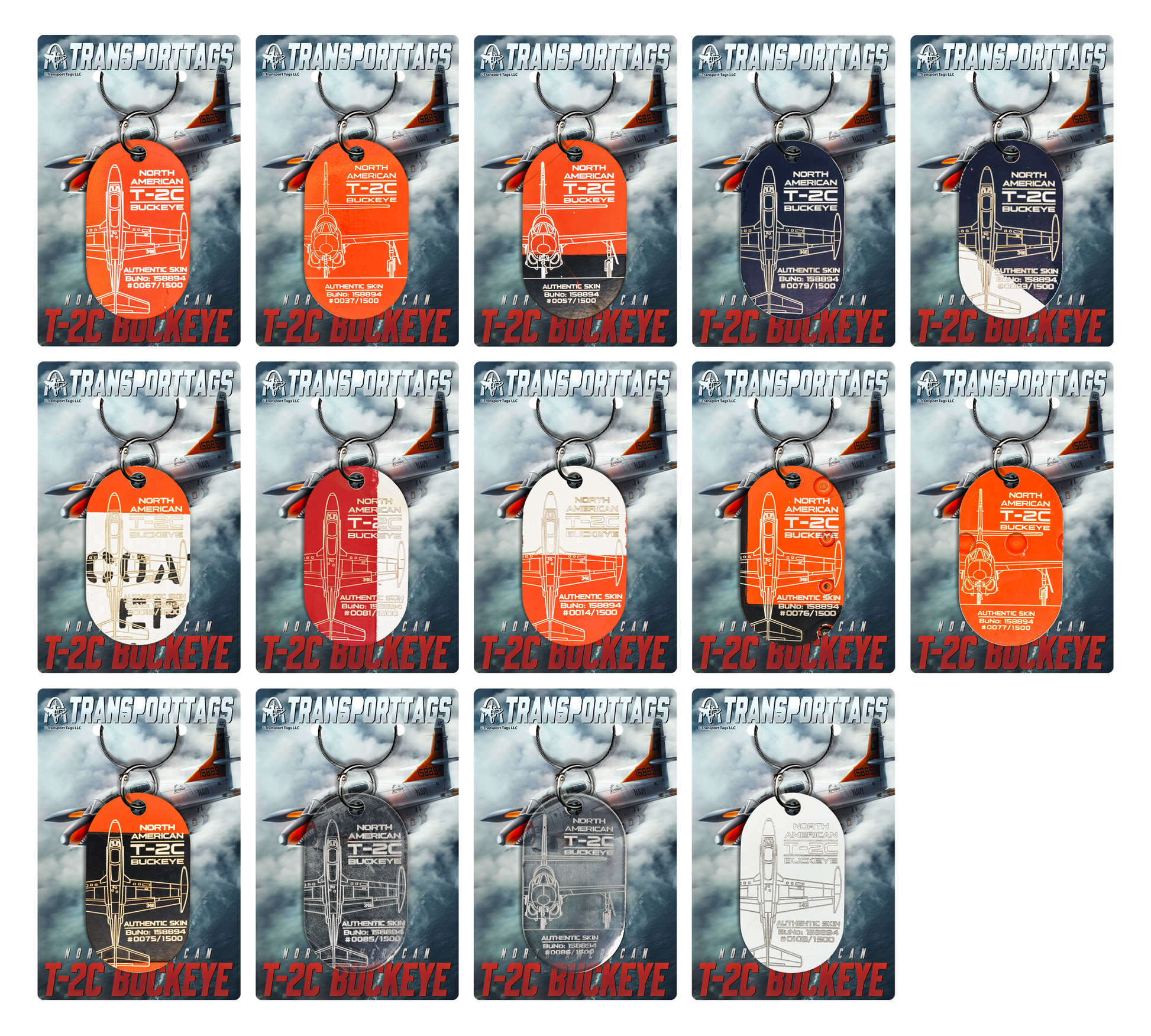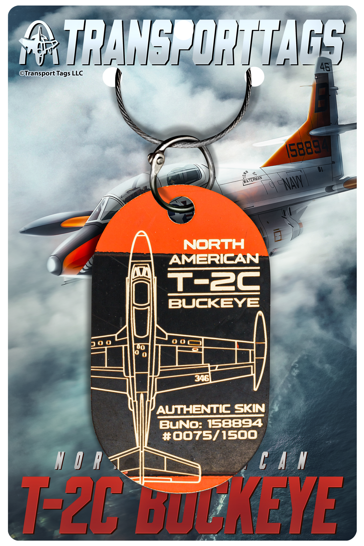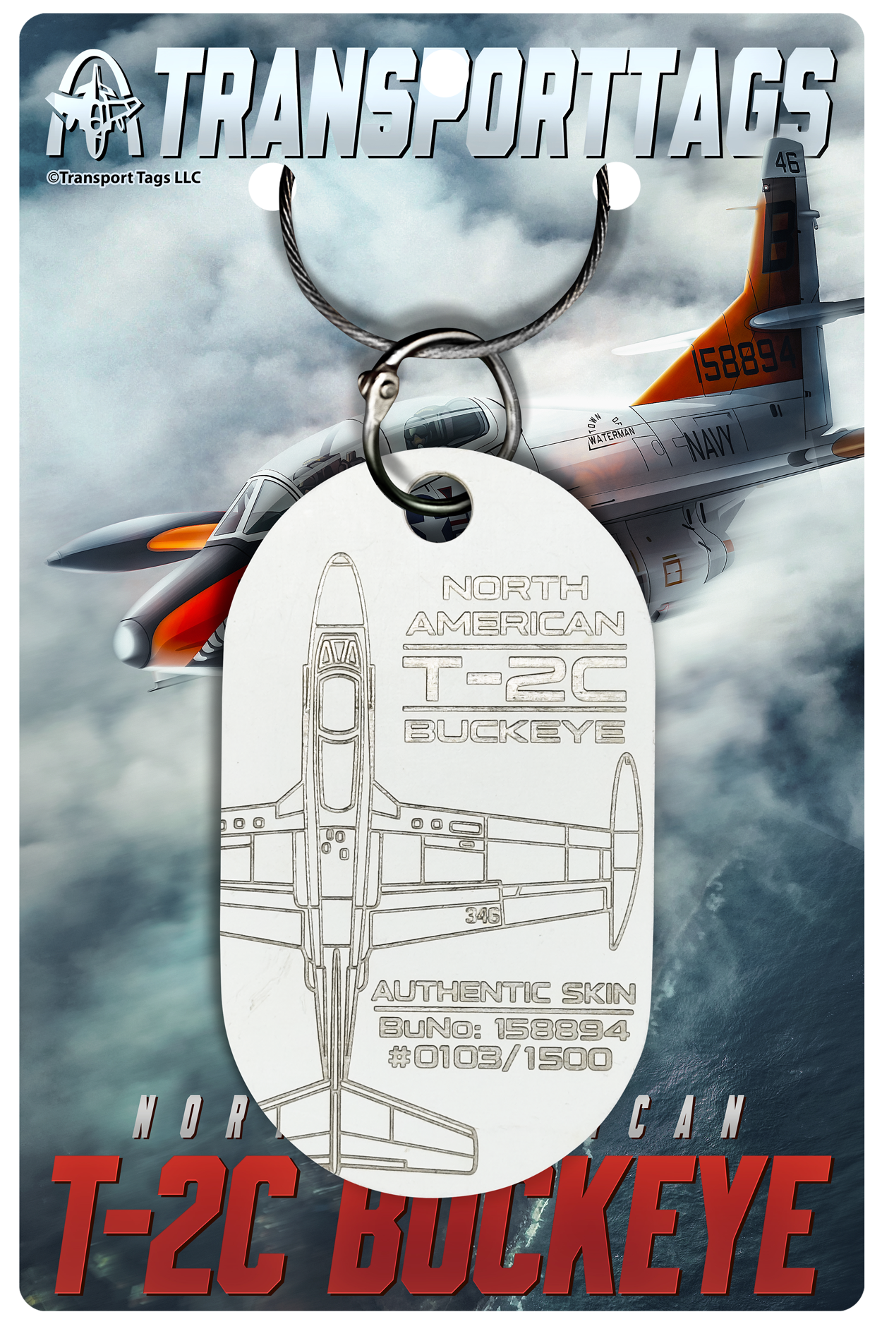 Introducing the T-2C Buckeye TransportTag. This T-2C served with the VT-23 “Professionals” at Brownsville, Texas, where it trained naval aviators in advanced jet techniques. In 2024, we were pleased to acquire the tail section and wing from BUNO 158894 — distinctive for its shark tooth nose livery — from AVMATS, through our valued friend and collaborator, Justin Giessman. We are thrilled to partner with him on this project to bring this aircraft’s history to life in our custom tags.